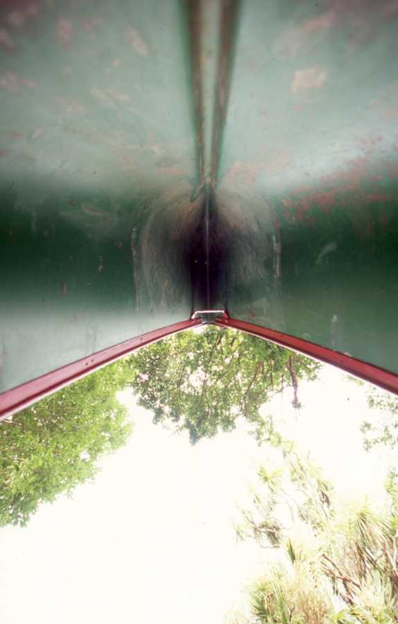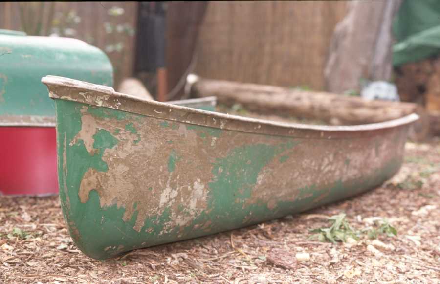 I sanded and painted the aluminum gunwale a solid red, contrasting with the green of the body and separating it from the (mainly) greens and browns of the yard.